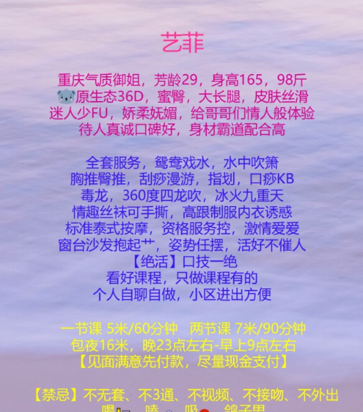 柔柔老师是在电报上无意间发现的,发的照片看着还不错,离的不是很远,介绍说的服务按照课表做,服务内容 ...